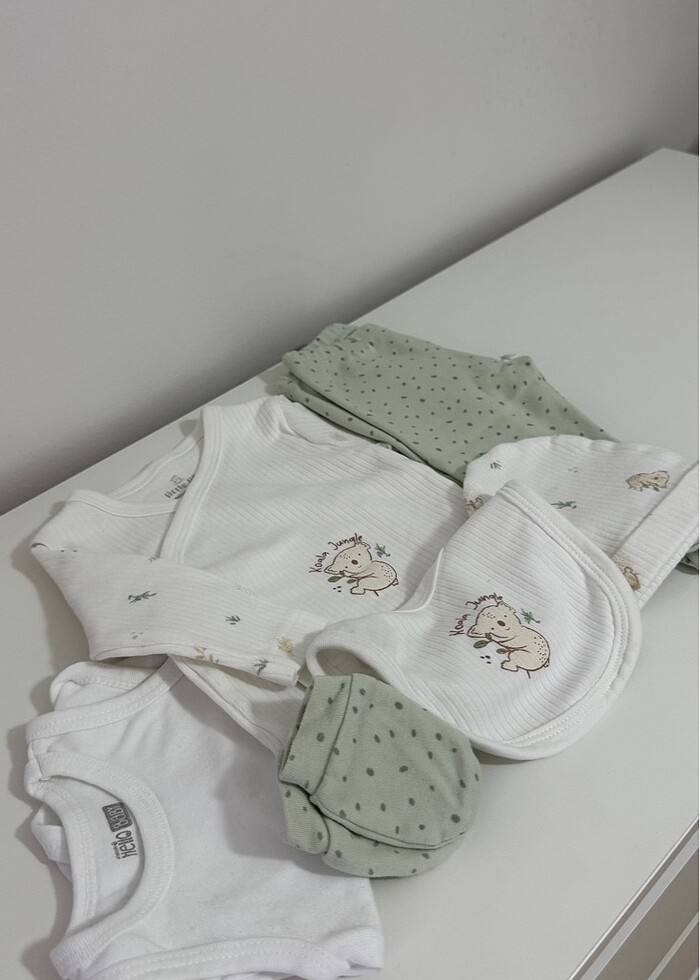 Yeni doğan set. (Hastane çıkışı) sadece bir kez giyildi. Hiçbir sorunu yoktur. Erkek bebek ve kız bebeğe uyumlu bir modeldir.