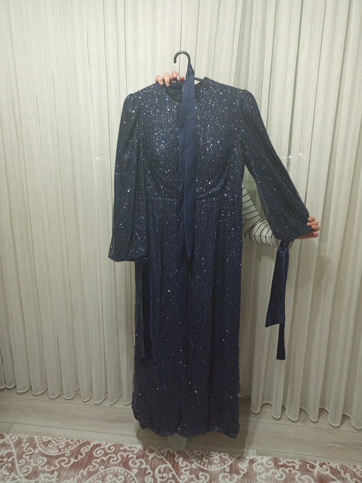 Yeni Elegans markalı, mavi işlemeli, parlak sentetik kumaştan yapılmış, zip detaylı. Notched lapel yaka kesimlidir. sadece deneme amaçlı giyildi sıfırdan farksız