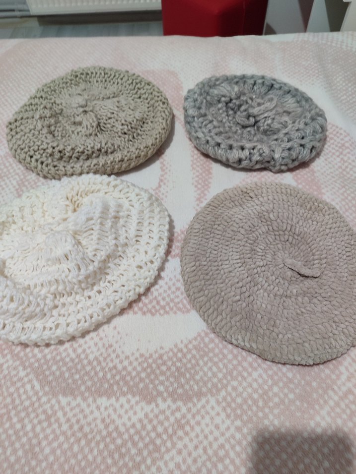 Bej, gri ve beyaz tonlarda, örgü kadın berelerden oluşan set. Rahat ve bohem tarzda, retro ve hippie havası katar.