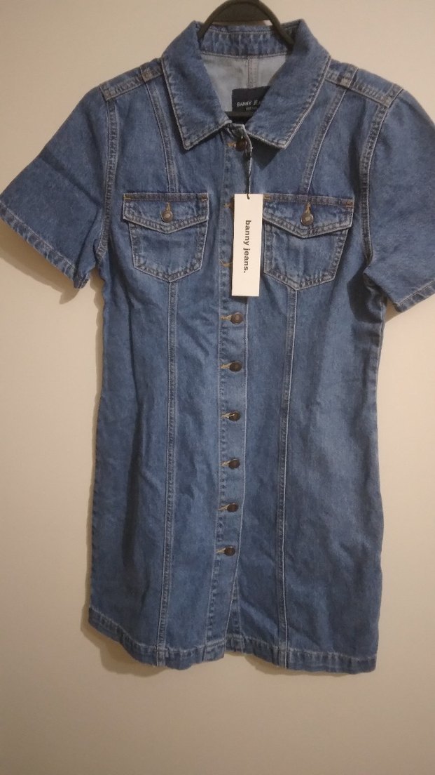 Yeni etiketli kot önden düğmeli ve kısa kollu lacivert denim elbise, notlu yaka ve göğüs cepleriyle sade bir tasarıma sahiptir. Günlük sokak stiline uygundur.