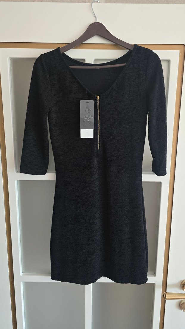Yeni etiketli hiç kullanılmamış siyah renkli önü fermuarlı günlük şık elbise ,S beden / iki koltuk altı arası:40 cm uzunluk:69 cm