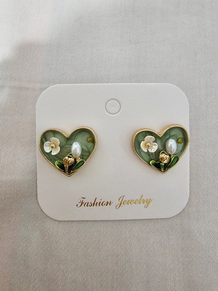 Yeni etiketli sıfır üründür. Pastel yeşil, çiçek desenli, kalp şeklinde, yeşil ve gold detaylı küpeler, romantik ve şık bir tarz sunar. İsteğe bağlı hediye paketi yapılır.