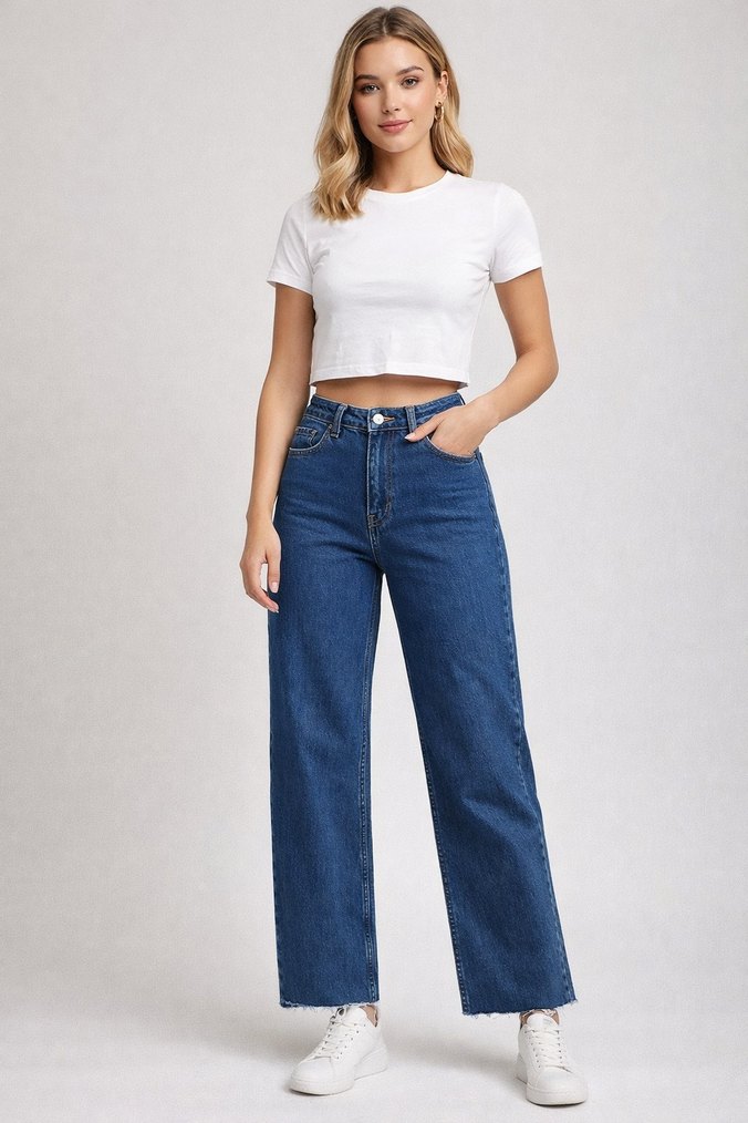 Regular fit midi kesim kot pantolon, klasik denim kumaşla günlük kullanım için rahat ve şık bir görünüm sunar. Beyaz tişört ve spor ayakkabıyla tamamlanır. ölçüler görselde mevcuttur.ölçülere göre alım yapınız.