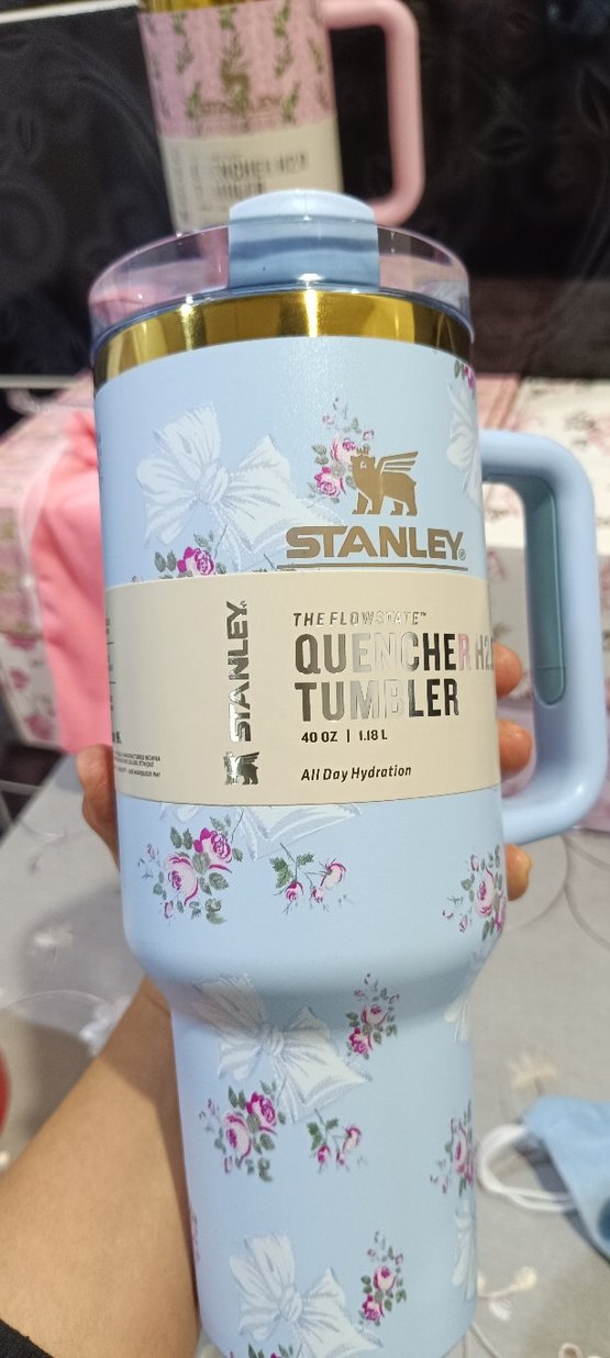 Stanley markalı, pastel mavi renkli, çiçek desenli ve saplı termos bardak. 1.18 litre kapasiteyle gün boyu suyunuzu yanında taşıyabilirsiniz.