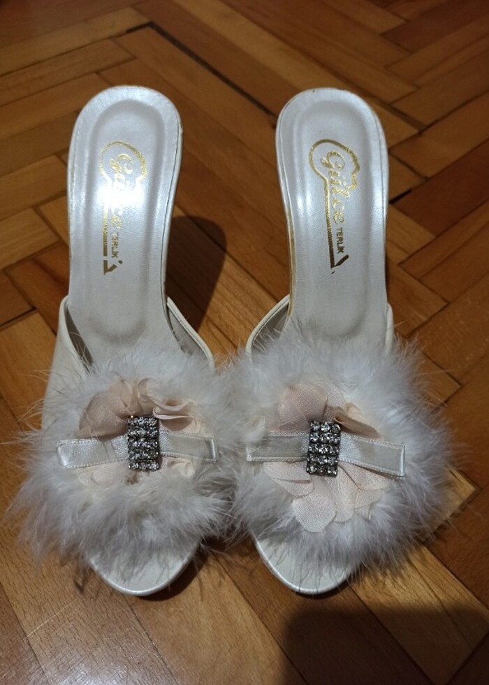 Deformesiz, sedef rengi. Tüylü ve tuysuz kullanim yepyeni çok tatlı çok şık. Düğün hazırlıkları esnasında aşırı şık duracak bi terlik.