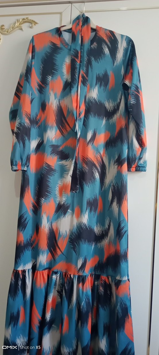Renkli uzun kollu, salaş kesim ve fırfırlı detaylara sahip bu uzun elbise, canlı batik desenli sentetik kumaftan yapılmıştır.