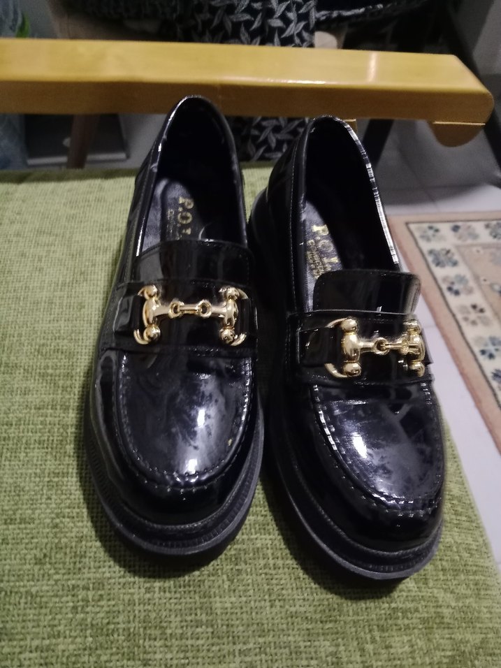 Parlak siyah kauçuk loafer ayakkabılar, altın tokalı ve hafif yılan desenli, gotik tarzda kız çocukları için.