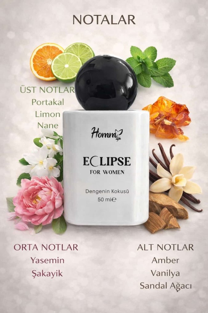Homm Life Eclipse kadın parfümü, armut, portakal çiçeği ve pembe biber üst notalarına sahiptir. 50 ml