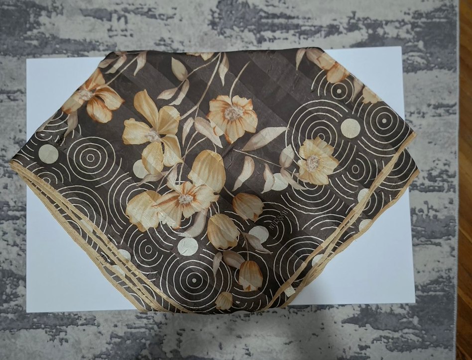 Kahverengi, pilili ve çiçek desenli kadın fuları, yumuşak sentetik kumaştan yapılmıştır ve vintage bohem tarzını yansıtır.