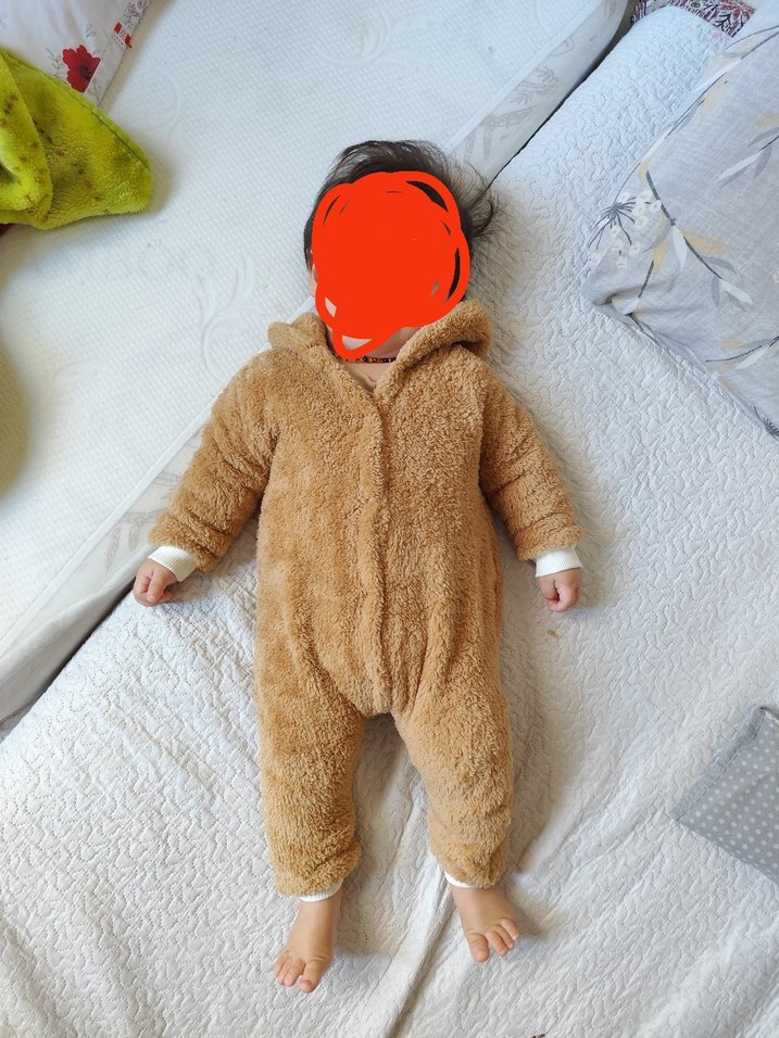 Kahverengi, yumuşak ve sıcak kumaştan yapılmış, kürk detaylı normcore tarzında bebek tulumu. 9 12 aya uygundur yenidir