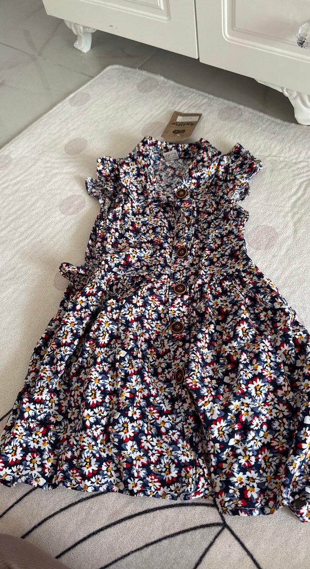 Yeni etiketli. 4-5 yaş. Kolsuz, yakalı ve fırfırlı detaylı, renkli tie-dye desenli kız çocuk elbisesi. Rahat kesimi ve bohem tarzıyla retro havası verir.