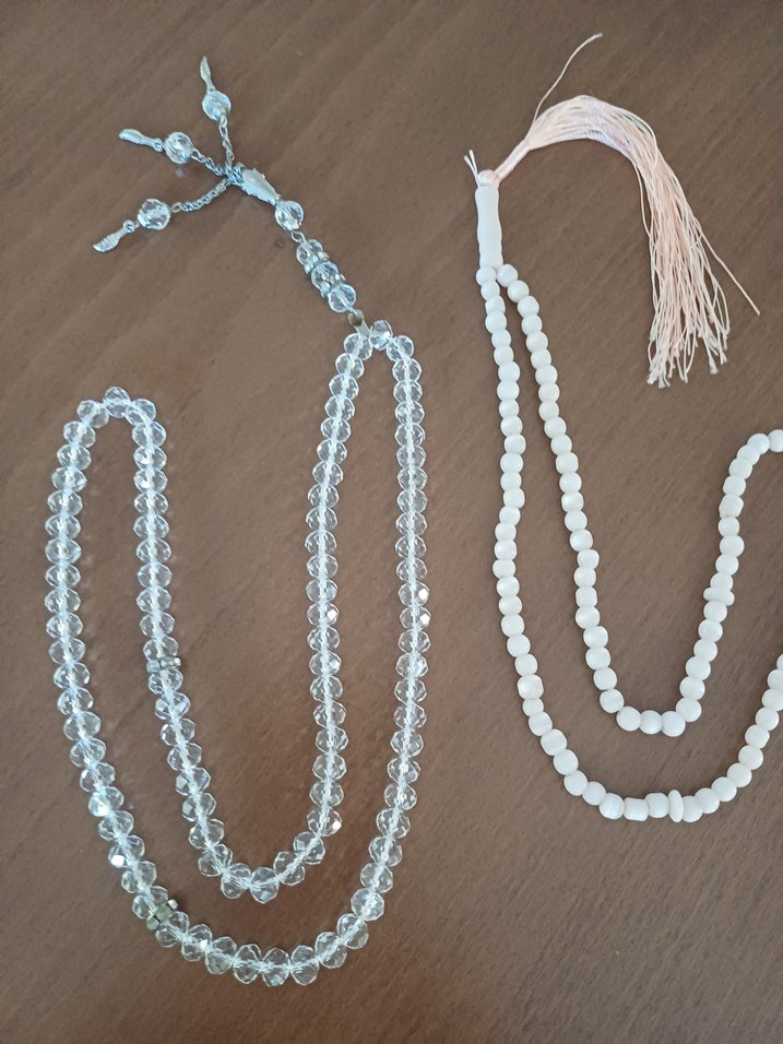 Yeni kristal kesmeli çeyizlik,hediyelik şık tesbih.Minimalist tarzda, beyaz ve şeffaf renklerde, yuvarlak ve pürüzsüz boncuklardan oluşan tesbihi. Püsküllü ve geleneksel kullanıma uygun. 2 adet fiyatıdır.