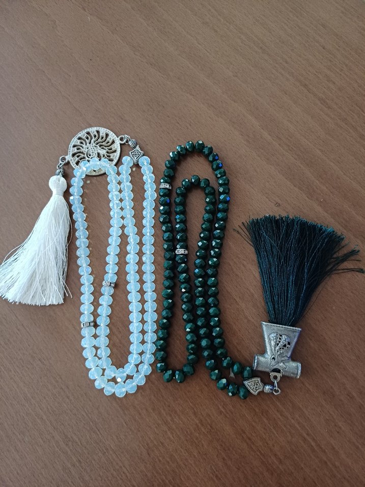Yeni kristal kesmeli çeyizlik, hediyelik şık tesbihi, püsküller ve metal süslemeler içerir.