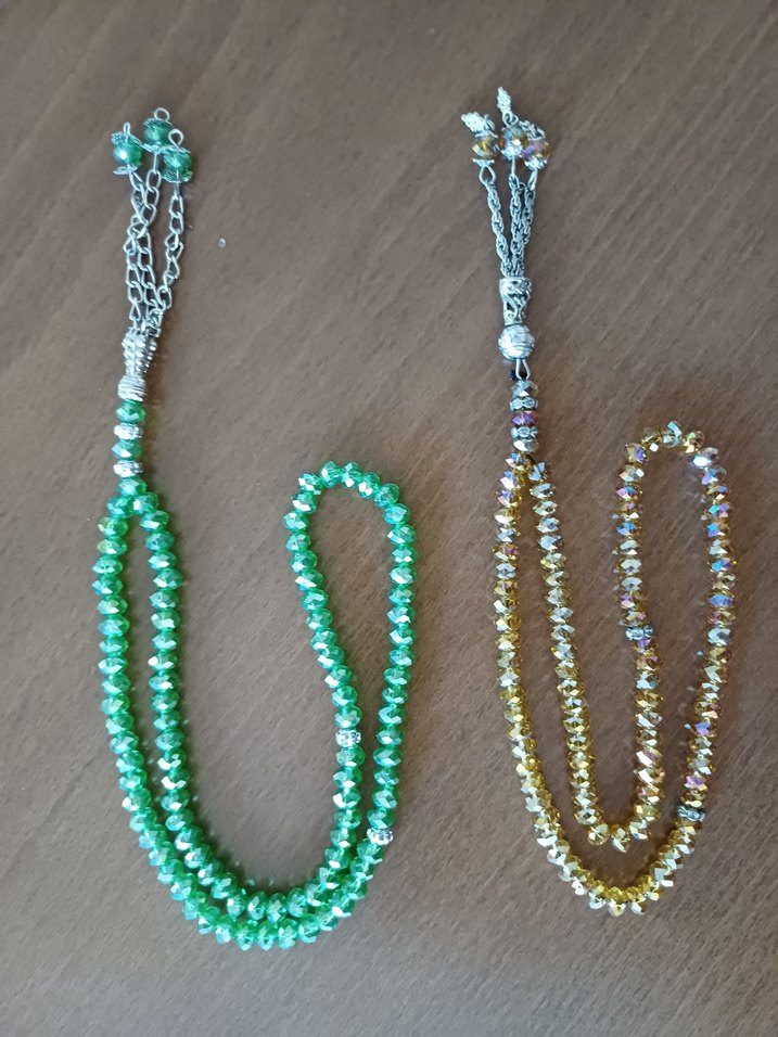 Yeni Yeşil ve altın renkli kristal boncuklardan oluşan, dekoratif zincir püsküllü renkli tesbih .Çeyizlik, hediyelik 2 adet fiyatıdır.