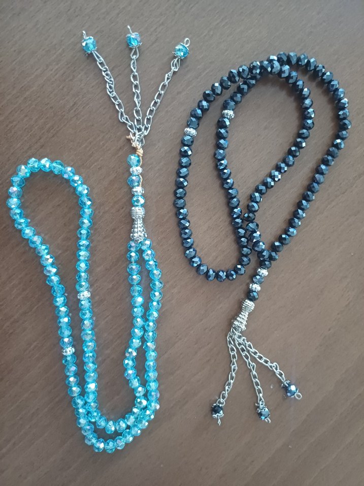 Yeni Turkuaz ve koyu renk kristal boncuklardan oluşan renkli bohem tarzı tesbih, zincir püsküllü. Canlı bir aksesuar olarak kullanılabilir. Çeyizlik hediyelik 2 adet fiyatıdır.
