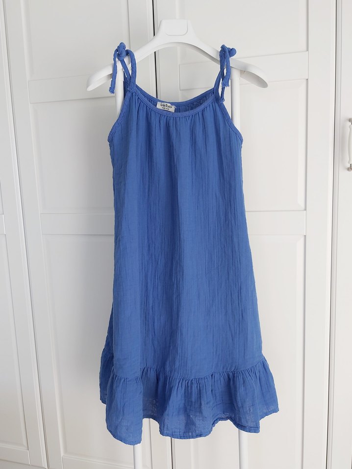 Mavi keten kumaştan, askılı ve straplez yaka, bol kesim kız elbisesi, alt kısmında fırfır detayı bulunur. Standart Beden
