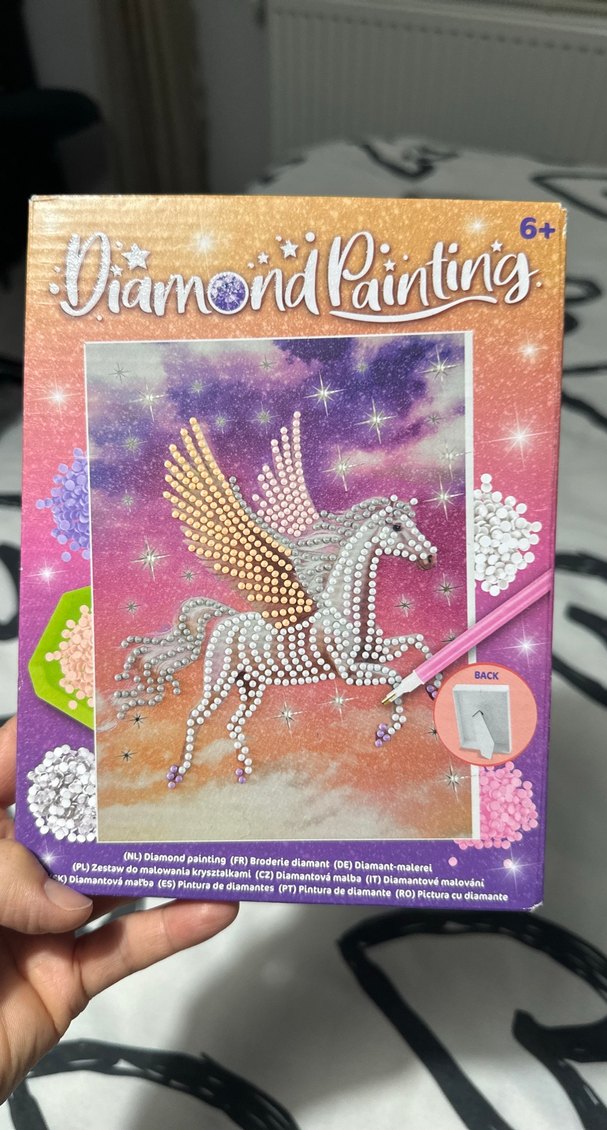 Yurtdışından aldık. Sıfır oyun. Kutusu açılmadı kesinlikle. Diamond painting oyunu. Oynamayı sevenler için harika bir ürün. Cercevelidir. Bitince cercevesiyle koyabiliyorsunuz. Hic bir kusuru yoktur. Sıfır paketi acılmadı !! Parlak kristallerle süslenmiş renkli Pegasus tasarımlı elmas boyama seti. 6 yaş ve üzeri için uygundur.