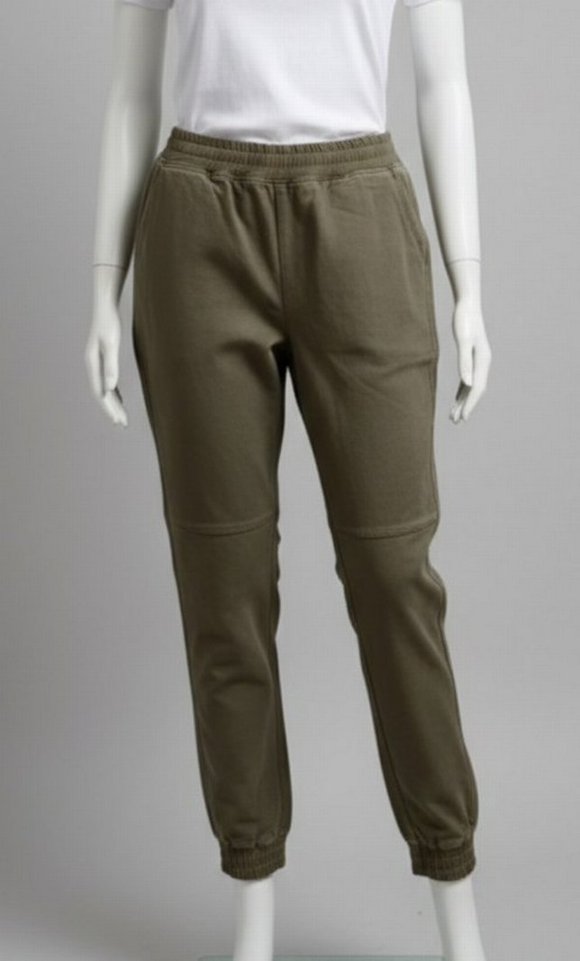 haki renkte, rahat kesim elastik bel ve paça detaylı, ön cepli günlük kullanıma uygun kadın pantolonu. sıfır ürün