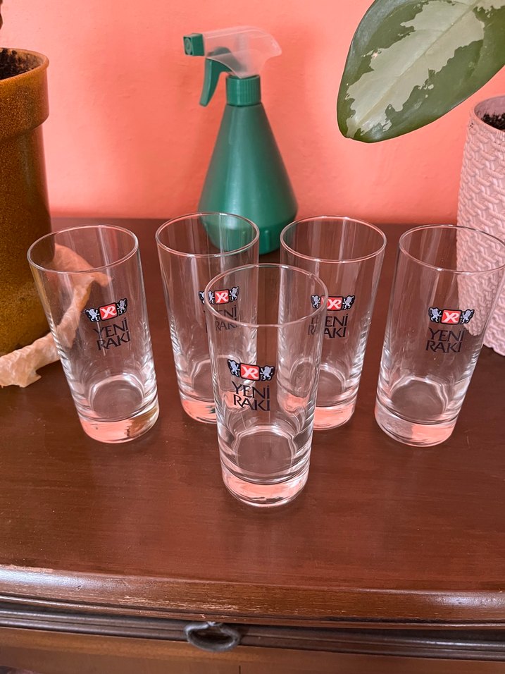 Bej renkte, üzerinde Yeni Rakı logosu bulunan 5'li cam bardak seti. Rakı veya diğer içecekler için uygundur. #rakıbardağı #yenirakı