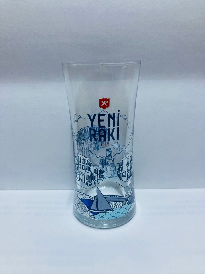 Uzun ve şeffaf bardakta açık mavi deniz ve şehir temalı desenler, üzerinde 'YENİ RAKI' yazısı yer alıyor. Detaylı mavi çizimler bulunur.