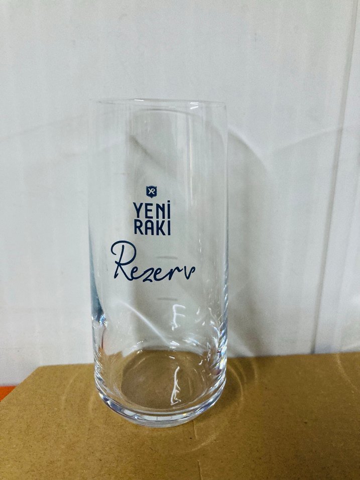 Üzerinde koyu mavi Yeni Rakı Rezerv yazısı bulunan şeffaf bardak. Adet fiyatıdır
