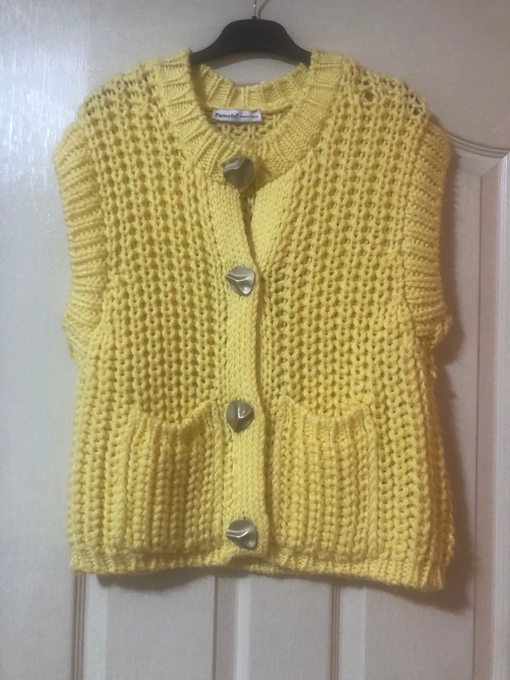 Salaş kesim, kolsuz sarı örgü kadın süveter. Bisiklet yaka ve ön cepler bulunur. Pastel ton, rahat ve bohem tarzda günlük kullanım için.