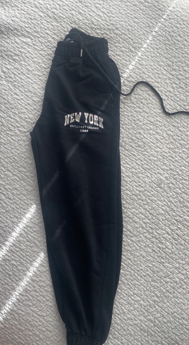Siyah, bol kesim kadın eşofmanı, New York baskılı ve fermuarlı ceplidir. Yumuşak ve sıcak kumaştan, günlük kullanım için uygundur.