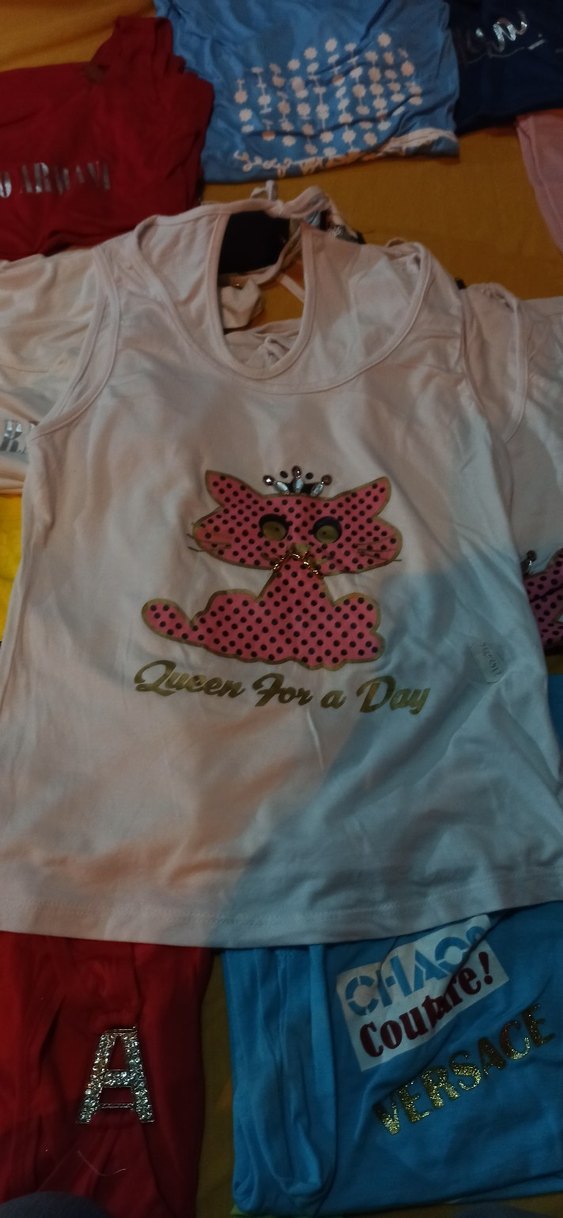 Kısa kollu, bisiklet yaka, pamuklu pembe kız çocuk tişörtü, payetli renkli baskılı kedi deseni ve "Queen For a Day" yazısı ile süslenmiştir.