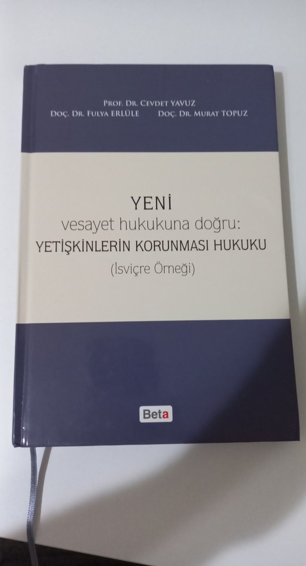 İlk birkaç sayfada altı çizili yerler vardır. Bu hukuk kitabı, İsviçre örneğiyle yetişkinlerin korunması hukukunu ele alıyor. Yazarlar Prof. Dr. Cevdet Yavuz, Doç. Dr. Fulya Erlüle ve Doç. Dr. Murat Topuz'tur.