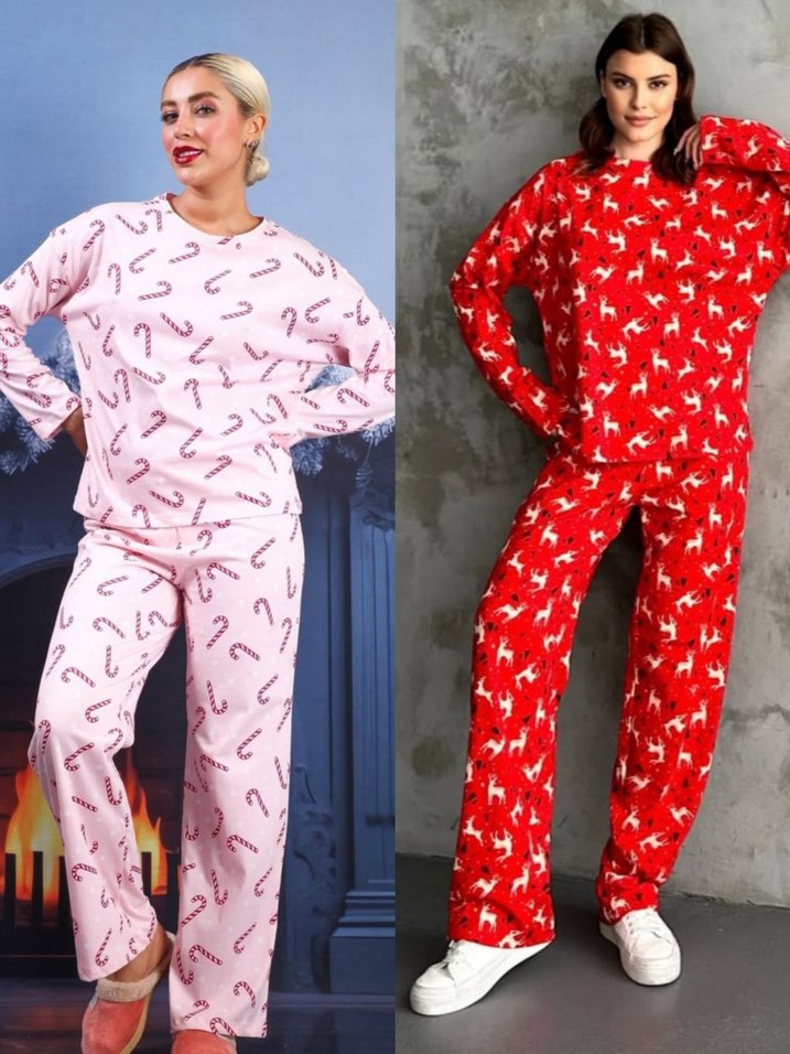 Kadın yeni yıl temalı pembe ve kırmızı pamuklu pijama takımları renk ve beden sorunuz yeni ilan açtırınız.marka temsilidir