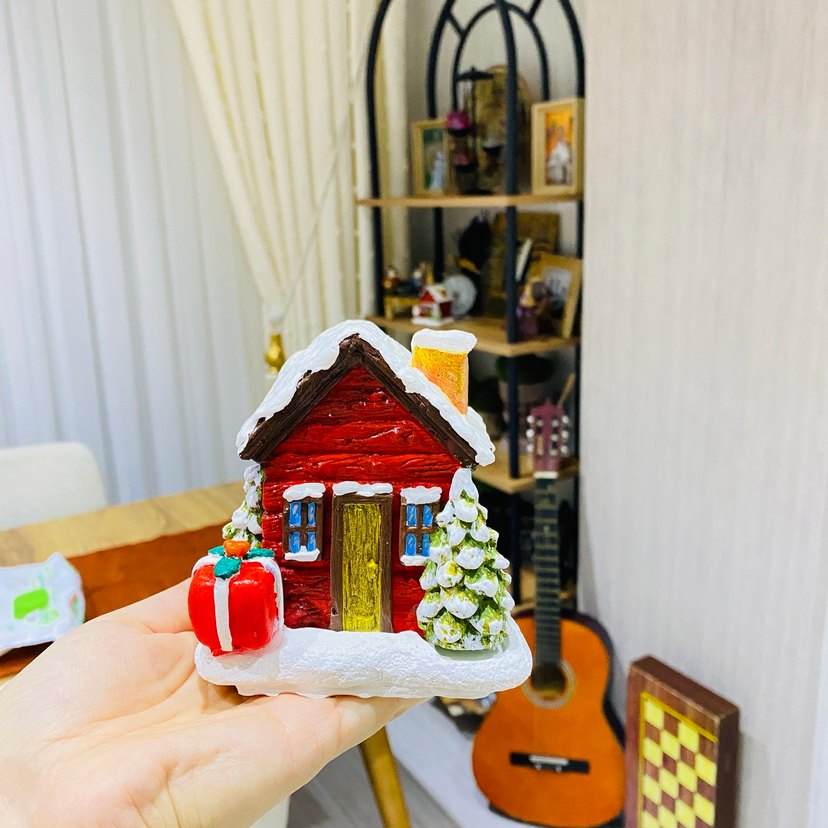 Karla kaplı çatısı, Noel ağacı ve hediye kutusuyla süslenmiş renkli kırmızı ev figürlü tütsülük. İkinci görselde tütsü dumanının nasıl çıktığı gösterilmiştir