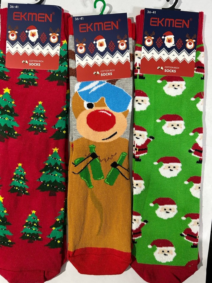 Ekmen markalı, yumuşak kumaştan yapılmış, renkli çoraplar. Noel temalı ağaç, geyik ve Noel Baba desenleri içerir. #biricikicgiyim #çorap #corap #yeniyıl #yılbaşı #noel #hediye #kadıngiyim