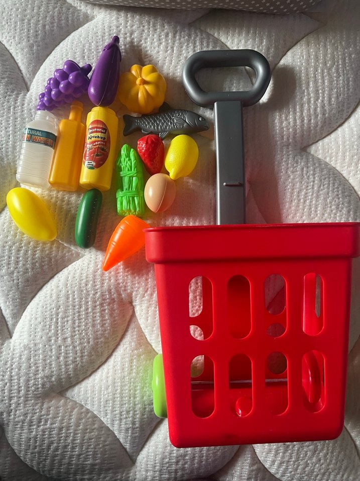 2-3 yaşa uygun Amerikadan , 2 yükseklik ayarlı kalın kaliteli plastik sepet ve mutfak oyuncakları, Çekmeli saplı kırmızı oyuncak sepet ve çeşitli renkli oyuncak sebze, meyve ve şişeler içerir.