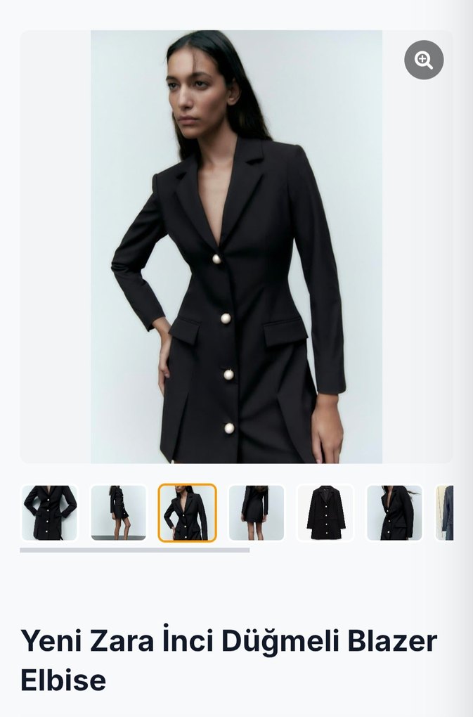 Yeni Zara siyah blazer elbise, inci düğmeleri ve keskin yaka detayıyla uzun kollu, regular fit ve şık tasarıma sahip. Ofis için uygun.