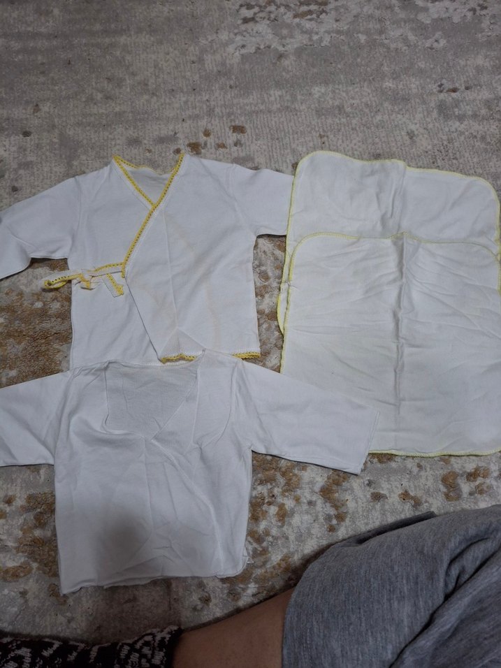 Yumuşak ve hafif kumaştan yapılmış beyaz erkek çocuk bornoz ve havlu seti. Bornoz, sarı kenarlık ve bağlama kemeri ile kapamalıdır.