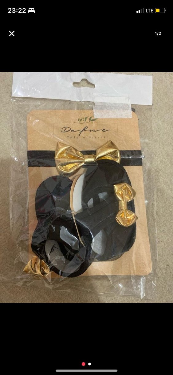 Altın renkli, fiyonk detaylı,çocuk saç bandı ve ayakkabısı