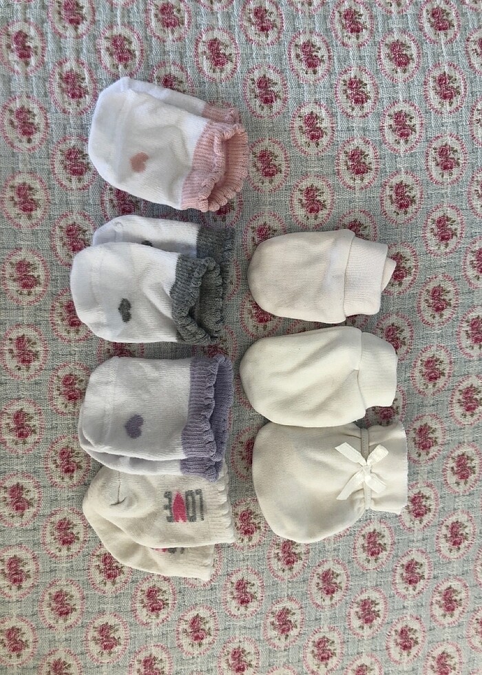 Yenidoğan için 3 adet eldiven 4 tane çorap Hiç kullanılmadı sadece yıkandı Hepsi 60tl