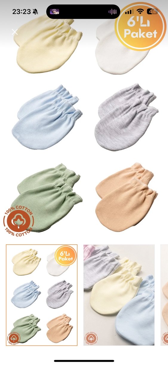 Yenidoğan için pastel renklerde, yumuşak pamuklu kumaştan basic triko eldivenler 6'lı paket halinde sunuluyor. Az kullanıldı.