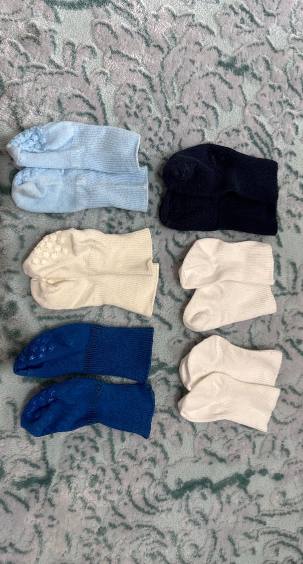 6 çift yenidoğan bebek çorapları. Üstteki 2 beyaz ve 1 lacivert çorap düz pamuk çoraplar. Alttaki mavi, bej ve koyu mavi çoraplar kaymaz taban çoraplardır