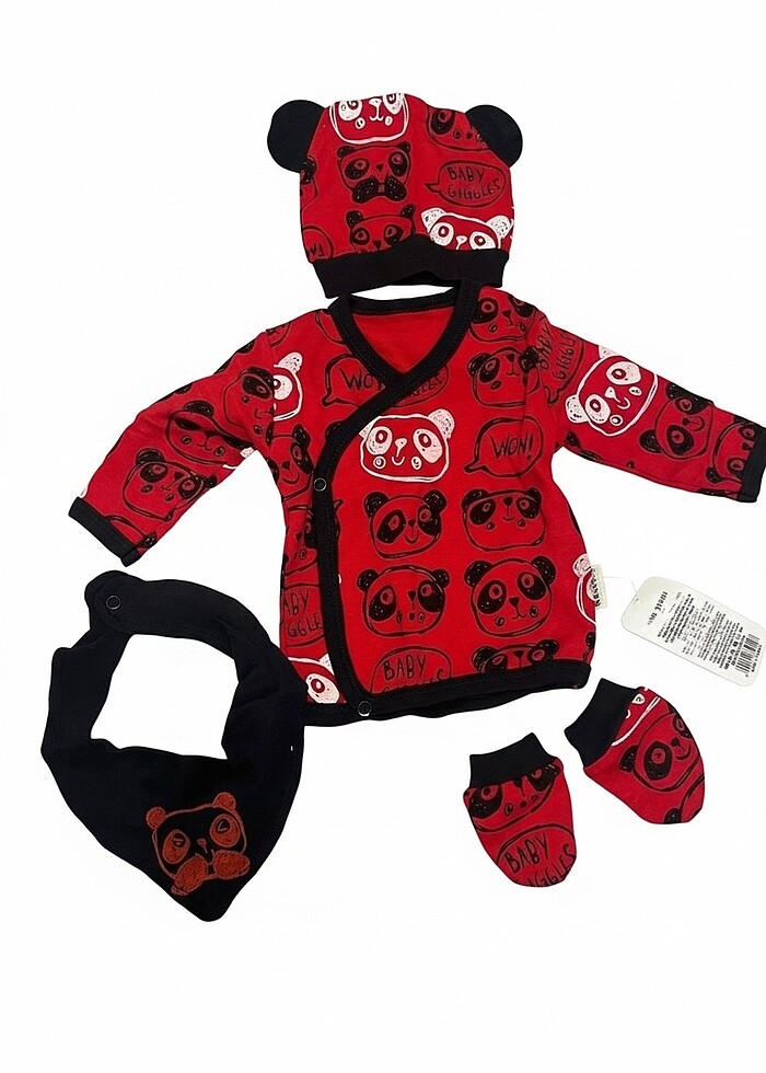 4’lü takım. Kırmızı renk, şapkalı, eldivenli, mama önlüğü.