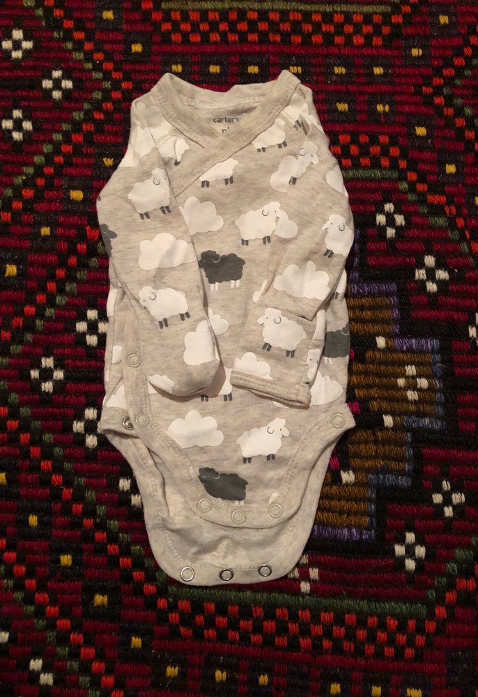 Kuzu desenli, uzun kollu, yuvarlak yakalı gri yün örme bebek body. Kendisinden eldivenli.Rahat ve sıcak tutar.