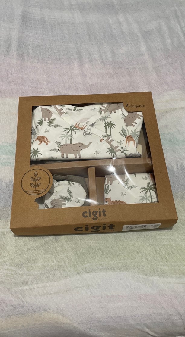 Cigit markalı, pamuklu kumaştan yapılmış, hayvan ve palmiye desenli açık renk gri bebek hastane çıkışı. Hiç kullanılmadı kutusuyla beraber gönderim yapacağım. Hastane çıkışı tam set organik takım