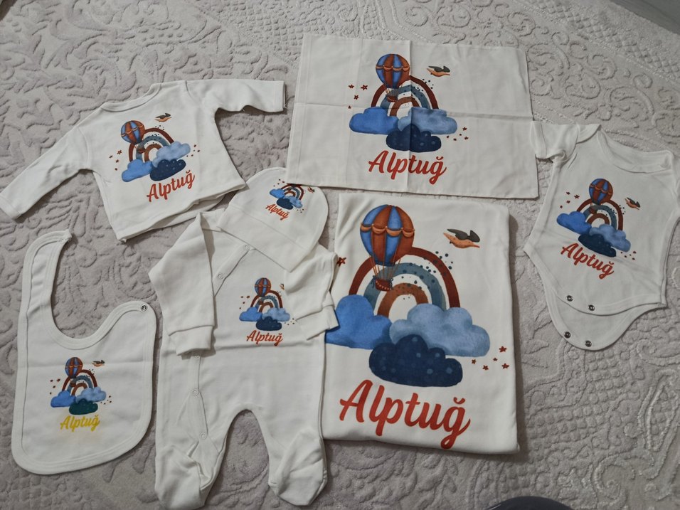 Sıfır ürün yenidoğan isimli takım Pamuklu bebek uyku seti, renkli baskılı sıcak hava balonu ve bulut desenli, "Alptuğ" ismiyle. Şapka, tulum ve battaniyeler içerir.