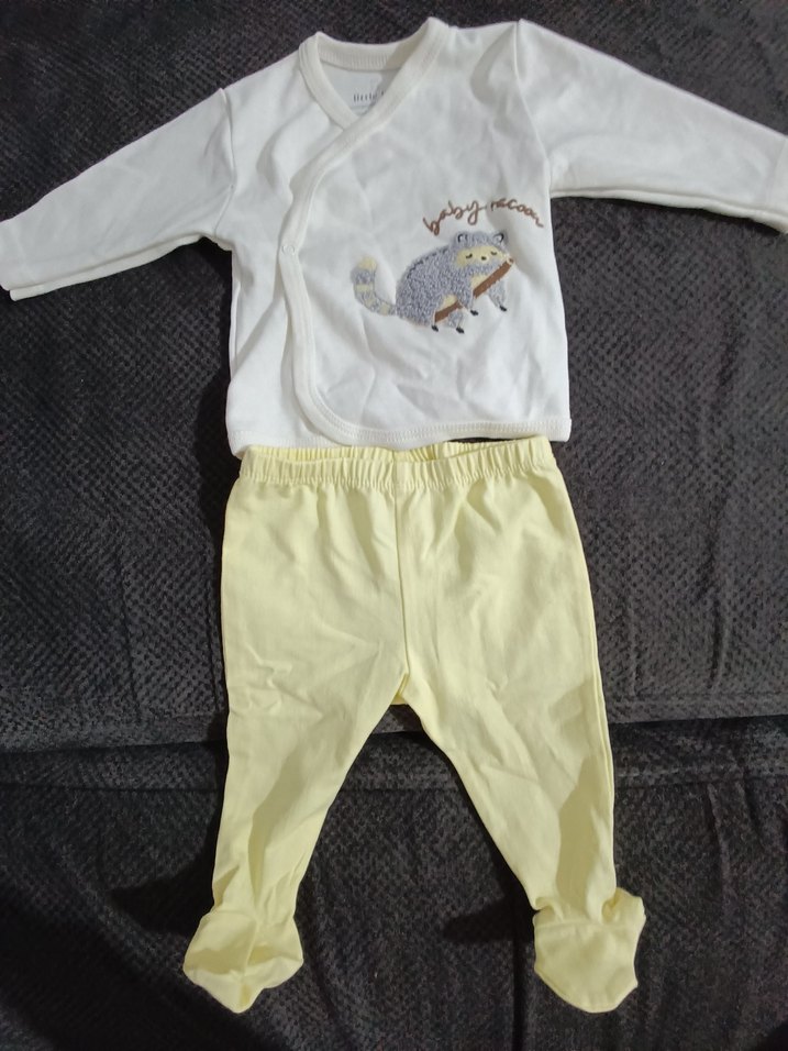 Hediye geldi sıfır ürün Beyaz uzun kollu, örme üstü rakun baskılı ve pastel sarı ayaklı pantolonlu yumuşak ve sıcak kumaştan bebek erkek takımı.