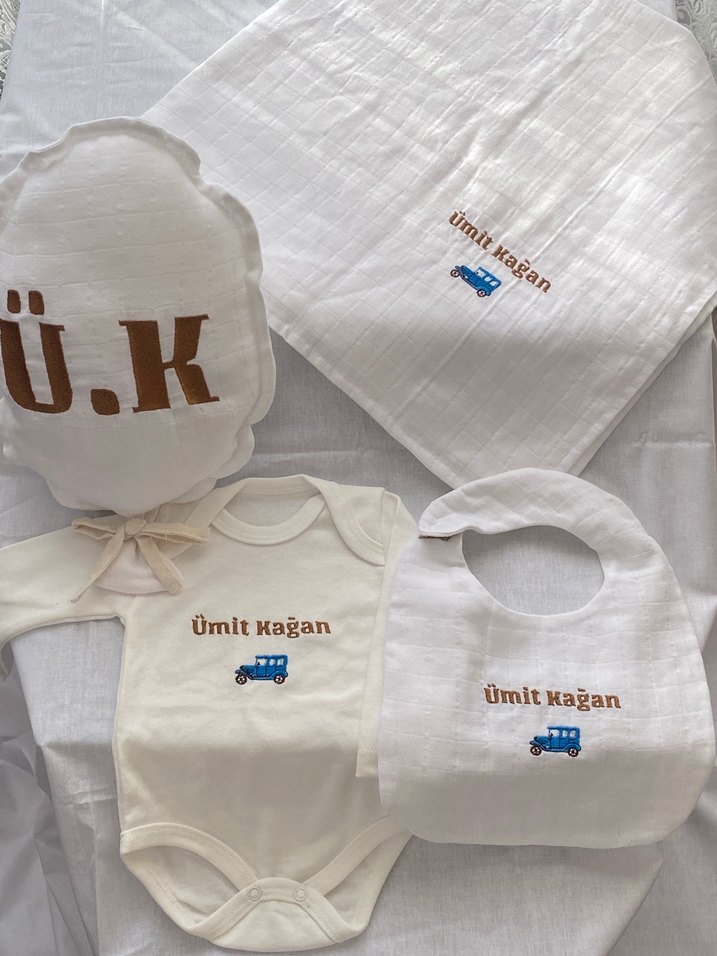 Beyaz renkte, yumuşak kumaştan yapılmış yenidoğan seti. İsme özel hazırlanır.