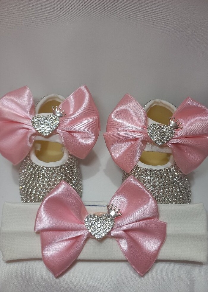 Tabanı 11 cm, gümüş zirkon taş işlemeli, pembe kurdeleli patik ve bandanası