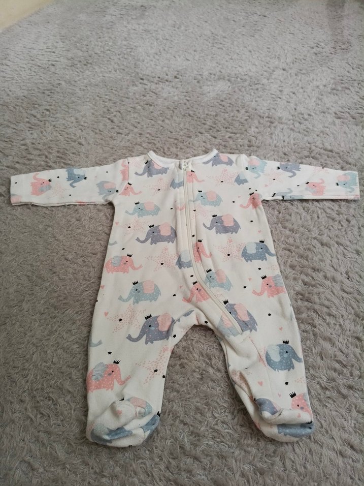 Yumuşak örme kumaştan, uzun kollu, bisiklet yaka, pastel fil desenli bebek body. Açık gri zemin üzerinde pembe, mavi ve gri fil figürleri.