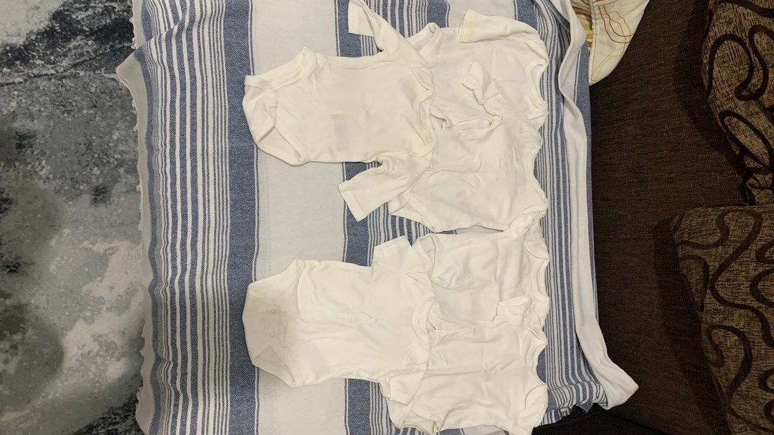 Yumuşak pamuktan, beyaz renkte kısa kollu ve yakalı bebek body seti, sade ve rahat bir tarz sunar. 3 adet uzun kollu 3 adet kısa kollu çıtçıtlı yenidoğan zıbın Hello baby marka e bebekten alındı uzun kollunun birinin kol ağzında leke var birinde de yaka kısmında hafif sararma mevcut