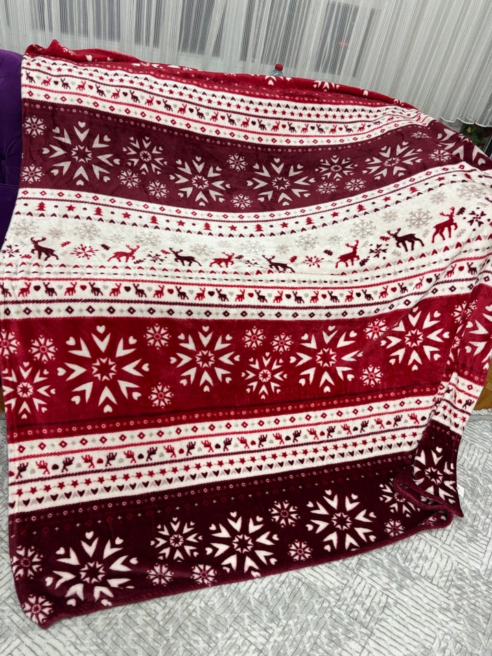 Bordo renkte, kar tanesi ve geyik desenli renkli battaniye, sıcaklık ve şık bir görünüm sağlar. ❄️ 150/200 cm boyutlarındadır #yeniyıl#yılbaşı