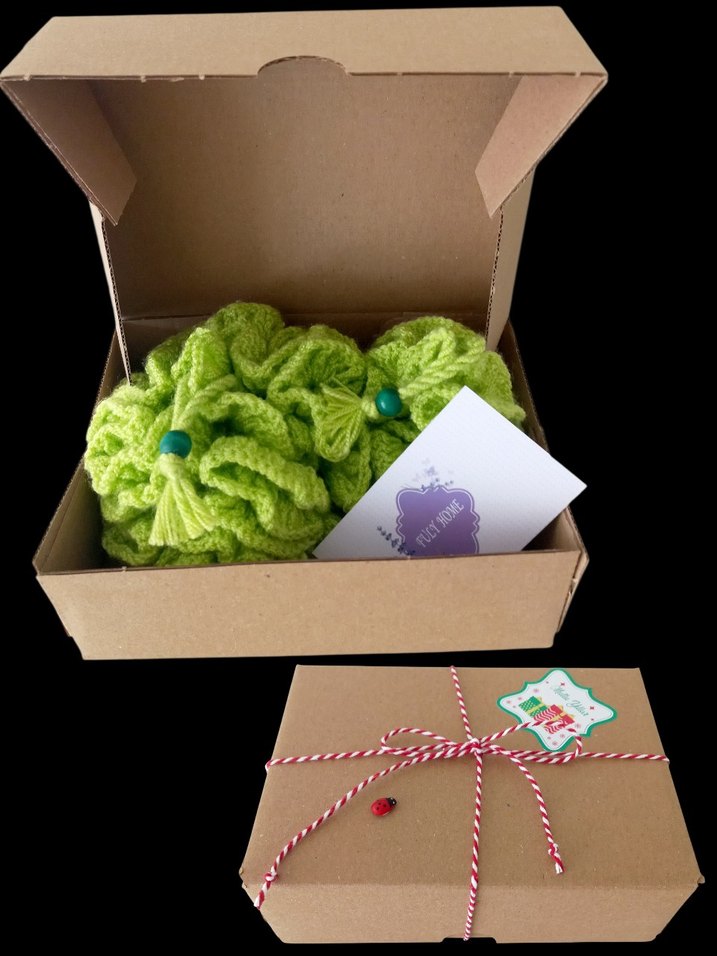 Yumuşak dokulu, yeşil renkli banyo duş seti , sade karton kutuda ip ve etiketle paketlenmiştir. Paket içeriğinde 1 adet vücut lifi, 1 adet yüz lifi bulunmaktadır. El emeği üründür.
